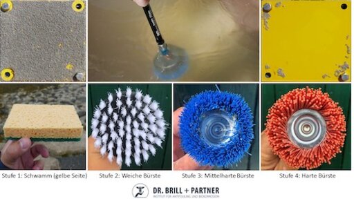 ”Cleaning” and “grooming” (cleaning at short intervals) are approaches to tackling fouling on ships that are (again) attracting increased attention. More and more manufacturers are relying on robust, cleanable but biocide-free hard coatings that have to be cleaned at regular intervals. Dr. Brill + Partner has developed suitable test procedures that approximate real-life situations as closely as possible. The test panels are cleaned under water using rotating brushes or high-pressure water jets at the intervals recommended by the manufacturer. The panels are inspected both before and after the cleaning process.